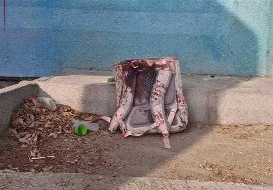 A bloodstained backpack left after the Israeli-US missile strike on Minab elementary girls’ school, Iran, February 28, 2026. BDS.